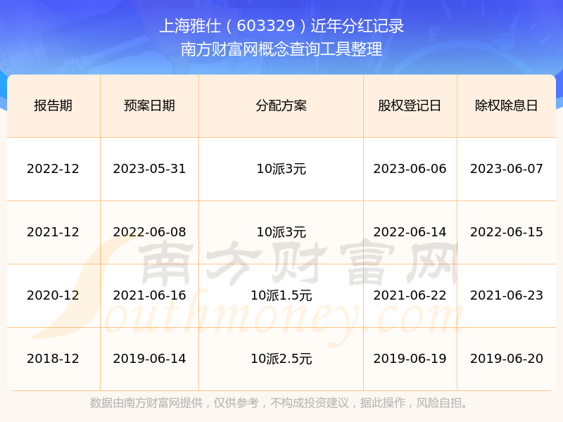 上海雅仕最新一次公布的分紅方案:10派3元。