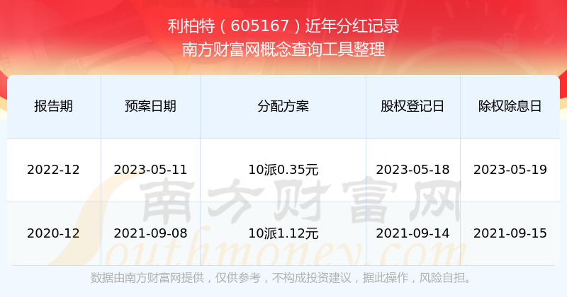 利柏特最新一次公布的分紅方案為10派0.35元。本次權(quán)益分派股權(quán)登記日為2023年5月18日,除權(quán)除息日為2023年5月19日,派息日為2023年5月19日。