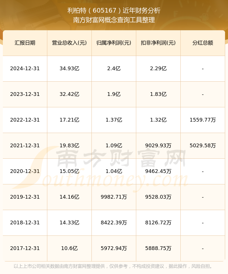 利柏特2024年總營收34.93億,同比增長7.72%;凈利潤2.4億,同比增長26.45%;銷售毛利率16.09%。