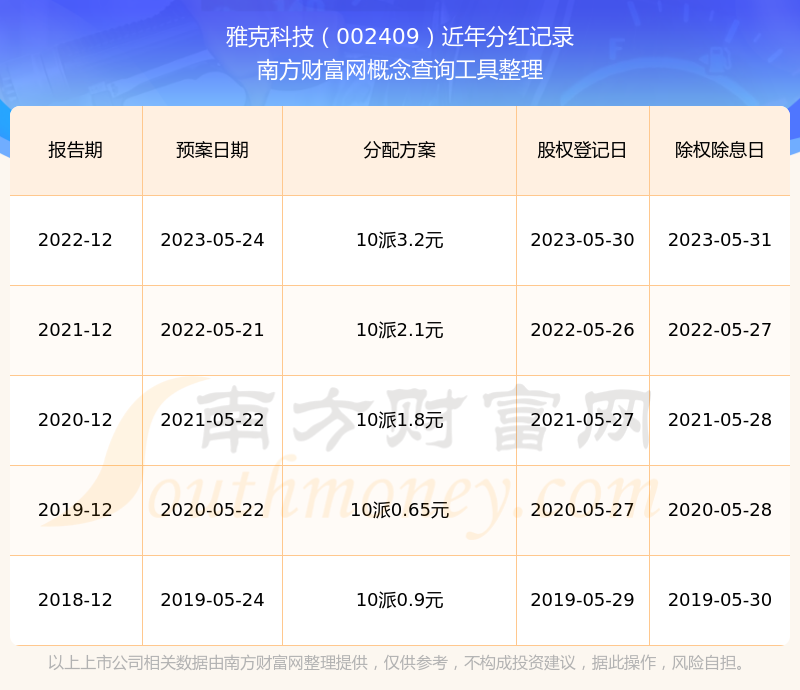 雅克科技最新一次公布的分紅方案為10派3.2元。本次權(quán)益分派股權(quán)登記日為2023年5月30日,除權(quán)除息日為2023年5月31日,派息日為2023年5月31日。