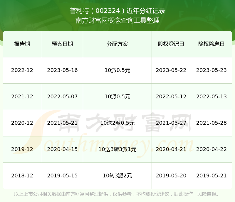 普利特最新一次公布的分紅方案為10派0.5元。本次權(quán)益分派股權(quán)登記日為2023年5月22日,除權(quán)除息日為2023年5月23日,派息日為2023年5月23日。