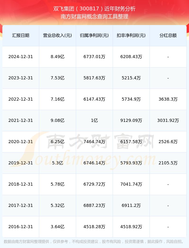 雙飛集團(tuán)2024年總營收8.49億,同比增長12.7%;凈利潤6737.01萬,同比增長15.8%;銷售毛利率25.48%。