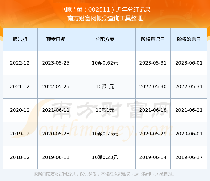 中順潔柔最新一次公布的分紅方案:10派0.62元。