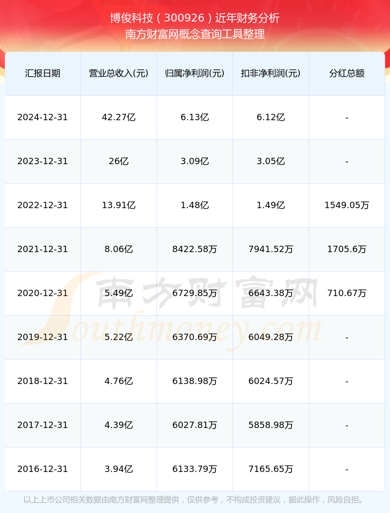 博俊科技公司2024年實(shí)現(xiàn)營(yíng)業(yè)收入42.27億元,同比增長(zhǎng)62.55%;凈利潤(rùn)6.13億元,同比增長(zhǎng)98.74%;毛利率27.63%。