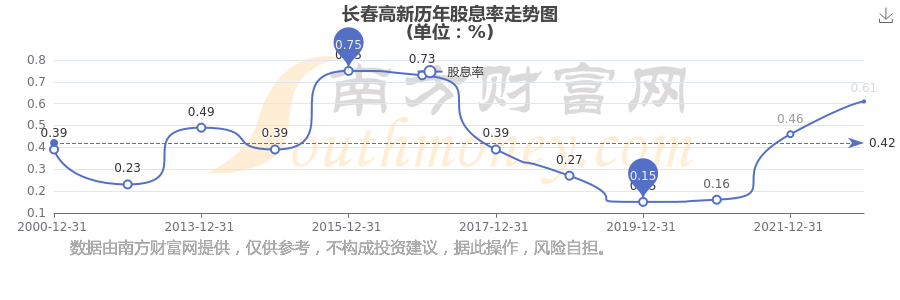 長(zhǎng)春高新歷年股息率走勢(shì)如下圖: