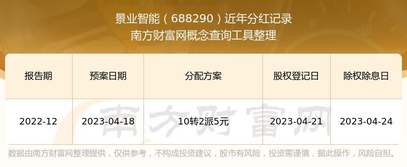 景業(yè)智能最新一次公布的分紅方案為10轉(zhuǎn)2派5元。本次權(quán)益分派股權(quán)登記日為2023年4月21日,除權(quán)除息日為2023年4月24日,派息日為2023年4月24日。