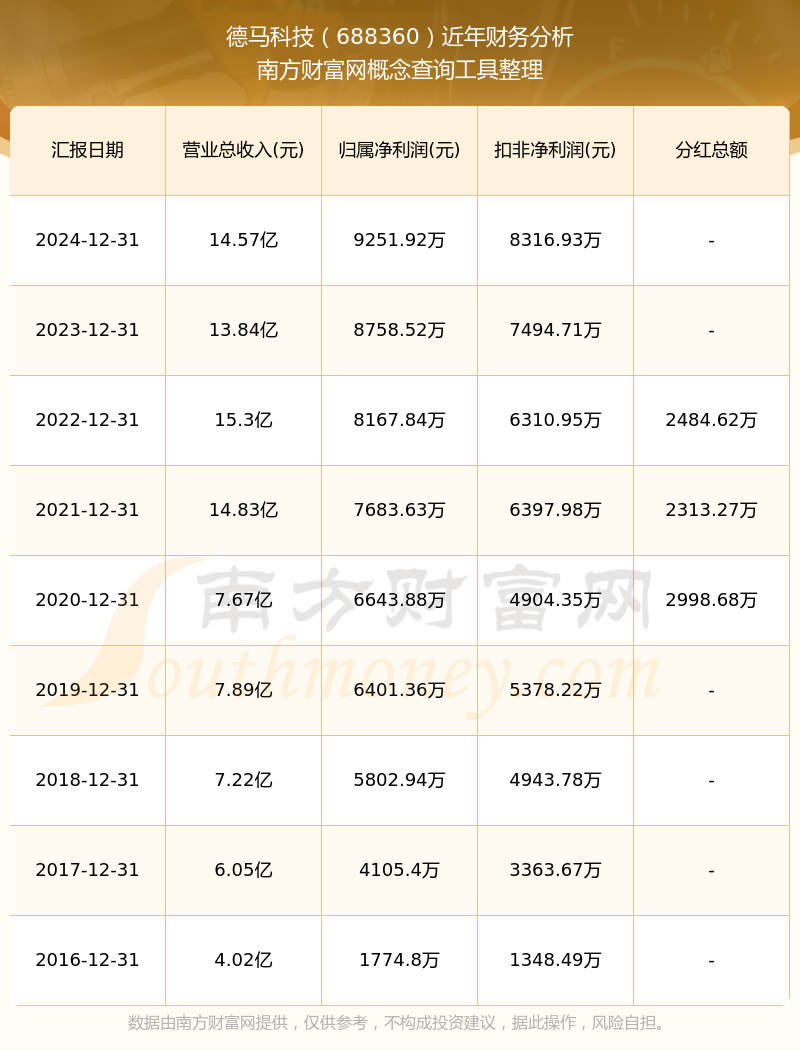 德馬科技公司2024年實(shí)現(xiàn)營(yíng)業(yè)收入14.57億元,同比增長(zhǎng)5.29%;凈利潤(rùn)9251.92萬(wàn)元,同比增長(zhǎng)5.63%;毛利率28.15%。