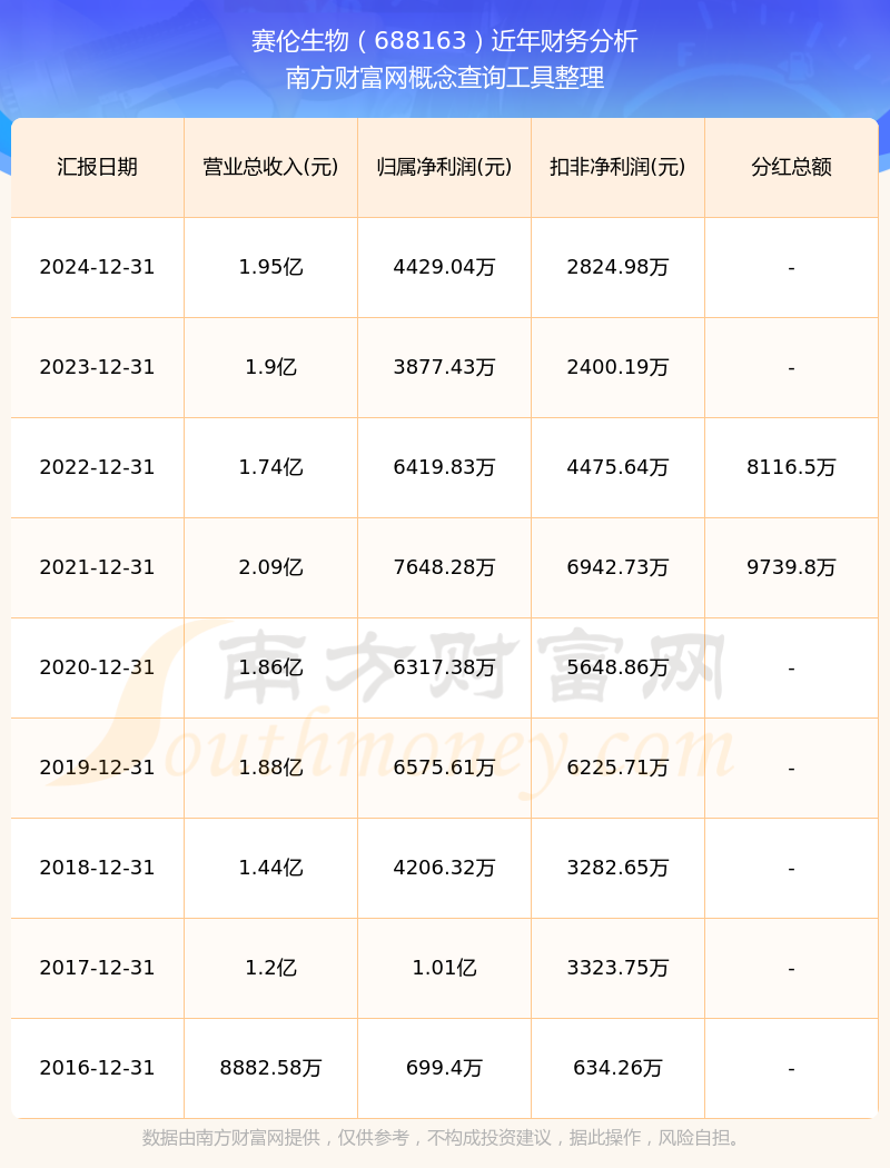 賽倫生物2024年總營(yíng)收1.95億,同比增長(zhǎng)2.51%;凈利潤(rùn)4429.04萬(wàn),同比增長(zhǎng)14.23%;銷(xiāo)售毛利率78.06%。