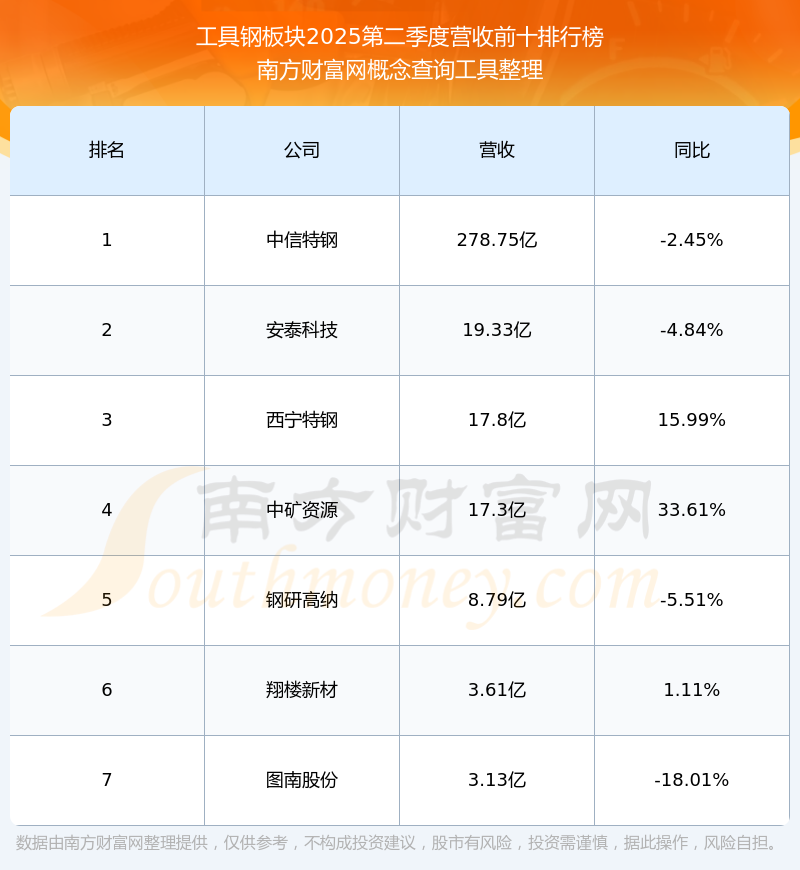 按照南方財(cái)富網(wǎng)概念查詢工具統(tǒng)計(jì),該股所屬板塊為工具鋼板塊,該板塊共有7只股票,撫順特鋼2025第二季度營(yíng)收在該板塊中排名為第7名,該板塊2025第二季度營(yíng)收排名前十的股票如下表: