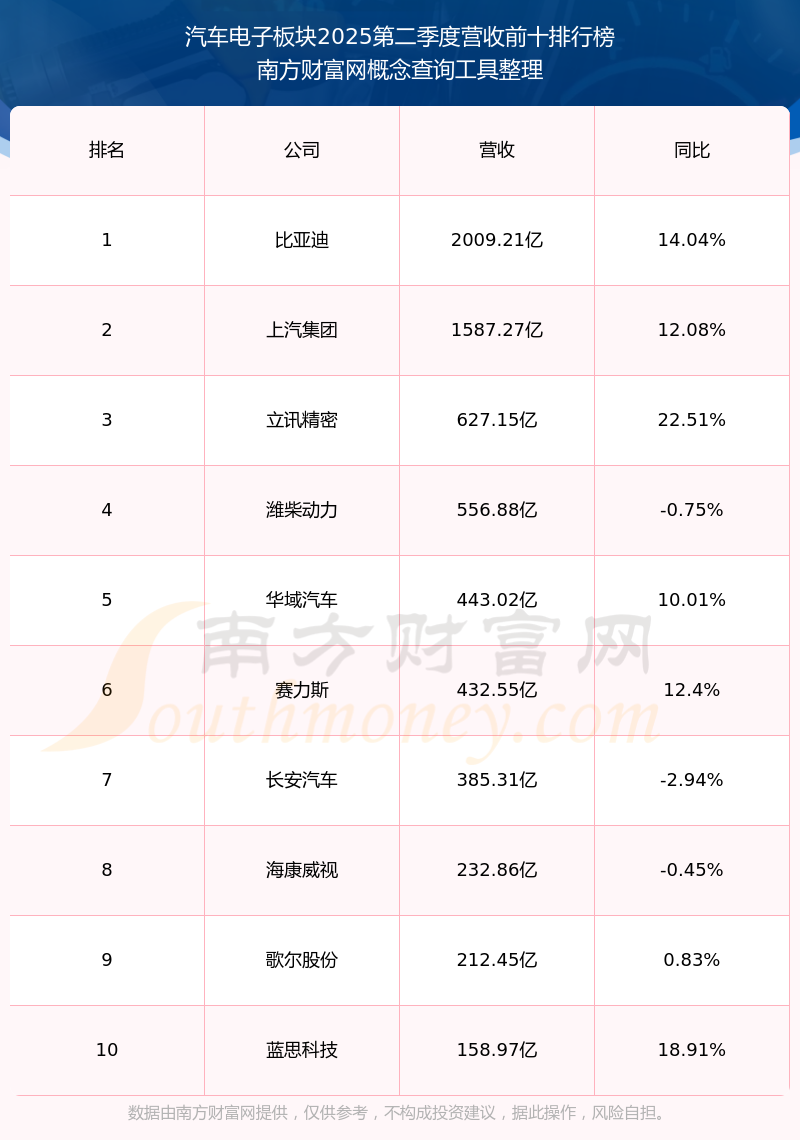 按照南方財(cái)富網(wǎng)概念查詢工具統(tǒng)計(jì),該股所屬板塊為汽車電子板塊,該板塊共有228只股票,合興股份2025第二季度營(yíng)收在該板塊中排名為第157名,該板塊2025第二季度營(yíng)收排名前十的股票如下表: