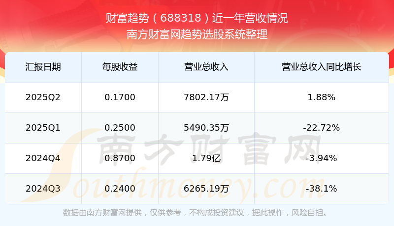 財富趨勢發(fā)布2025年第二季度財報。實現(xiàn)總營收7802.17萬元,同比增長1.88%;扣非凈利潤同比增長13.31%至4075.25萬元。