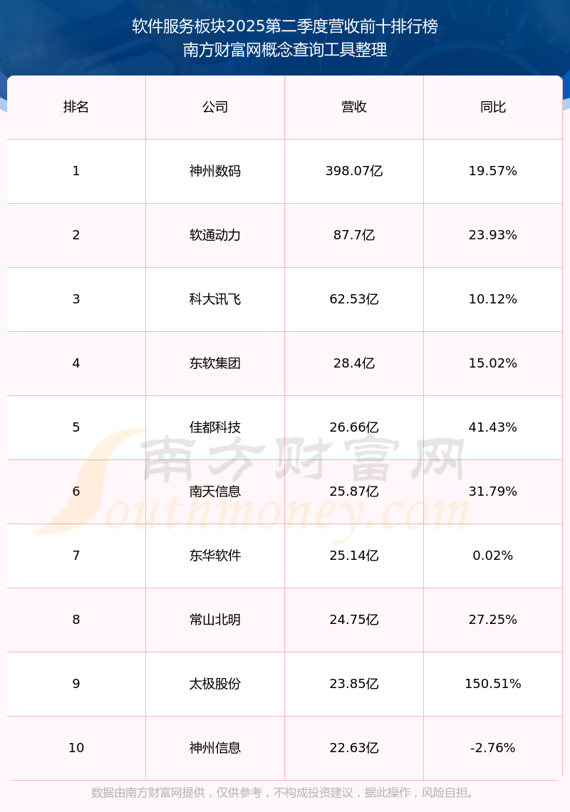 按照南方財富網(wǎng)概念查詢工具統(tǒng)計,該股所屬板塊為軟件服務(wù)板塊,該板塊共有300只股票,財富趨勢2025第二季度營收在該板塊中排名為第227名,該板塊2025第二季度營收排名前十的股票如下表: