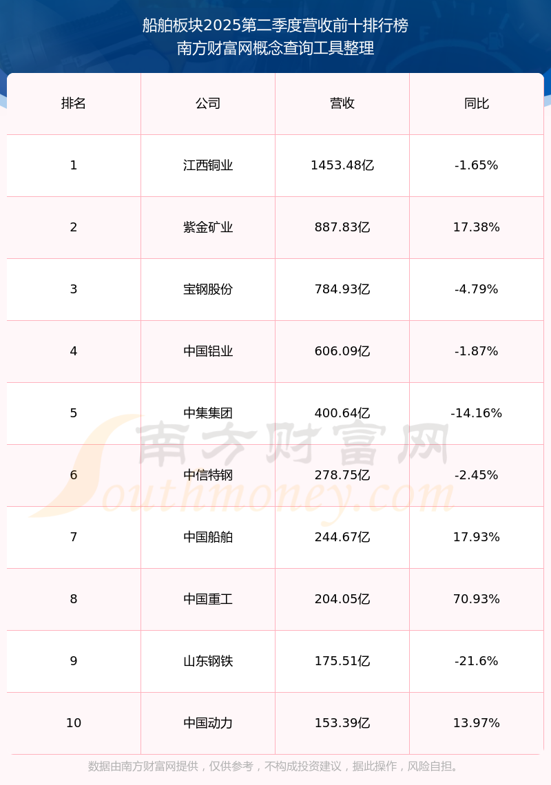 按照南方財富網(wǎng)概念查詢工具統(tǒng)計,該股所屬板塊為船舶板塊,該板塊共有46只股票,中國船舶2025第二季度營收在該板塊中排名為第7名,該板塊2025第二季度營收排名前十的股票如下表: