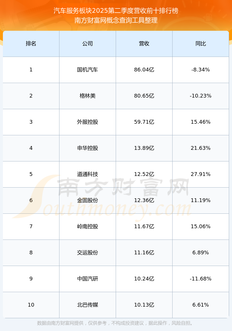 按照南方財(cái)富網(wǎng)概念查詢工具統(tǒng)計(jì),該股所屬板塊為汽車服務(wù)板塊,該板塊共有25只股票,申華控股2025第二季度營收在該板塊中排名為第4名,該板塊2025第二季度營收排名前十的股票如下表: