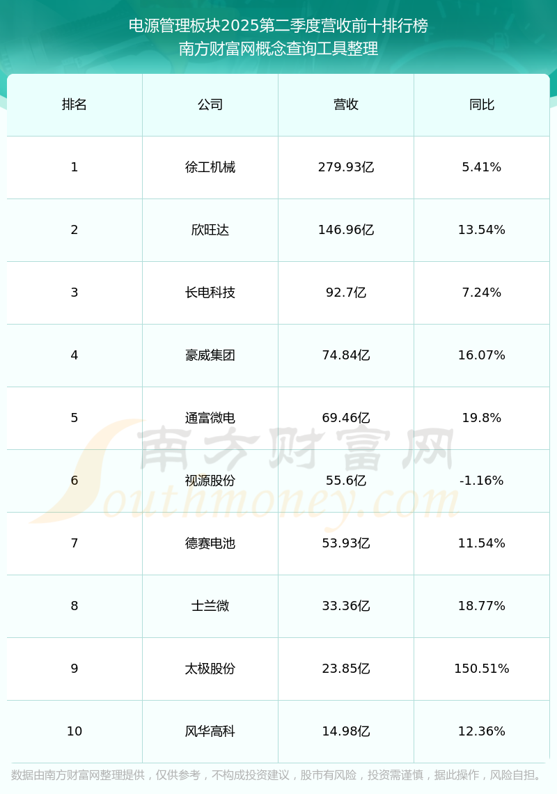 按照南方財富網(wǎng)概念查詢工具統(tǒng)計,該股所屬板塊為電源管理板塊,該板塊共有30只股票,帝奧微2025第二季度營收在該板塊中排名為第30名,該板塊2025第二季度營收排名前十的股票如下表:
