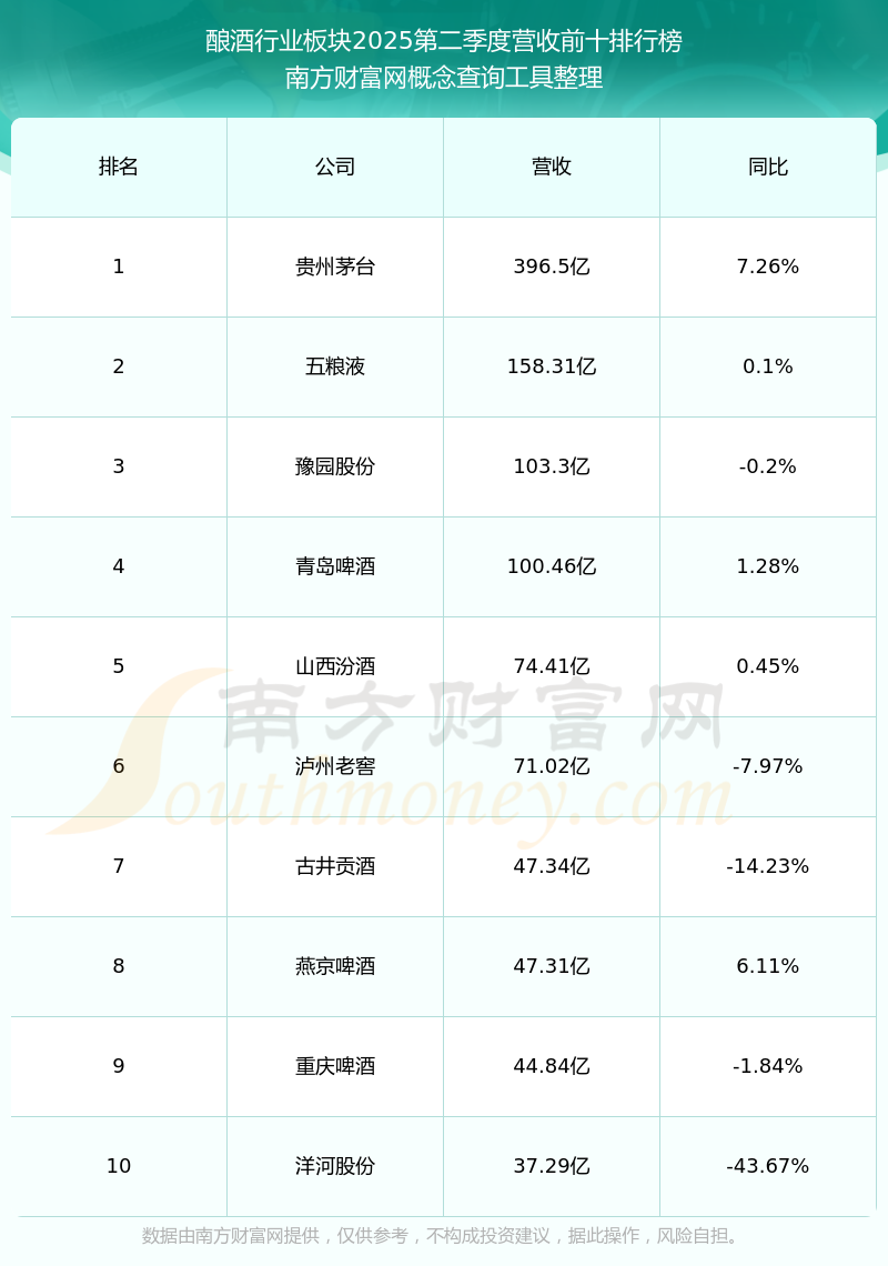 按照南方財(cái)富網(wǎng)概念查詢工具統(tǒng)計(jì),該股所屬板塊為釀酒行業(yè)板塊,該板塊共有42只股票,中信尼雅2025第二季度營(yíng)收在該板塊中排名為第41名,該板塊2025第二季度營(yíng)收排名前十的股票如下表: