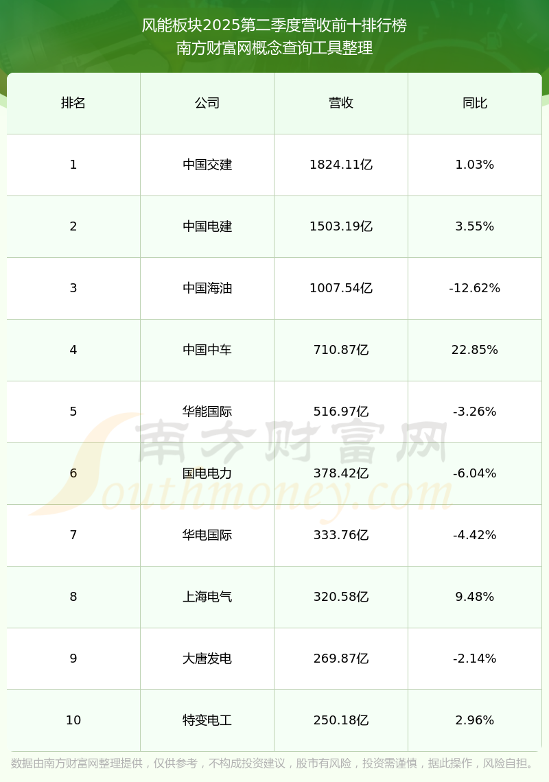 按照南方財富網概念查詢工具統(tǒng)計,該股所屬板塊為風能板塊,該板塊共有251只股票,節(jié)能風電2025第二季度營收在該板塊中排名為第122名,該板塊2025第二季度營收排名前十的股票如下表: