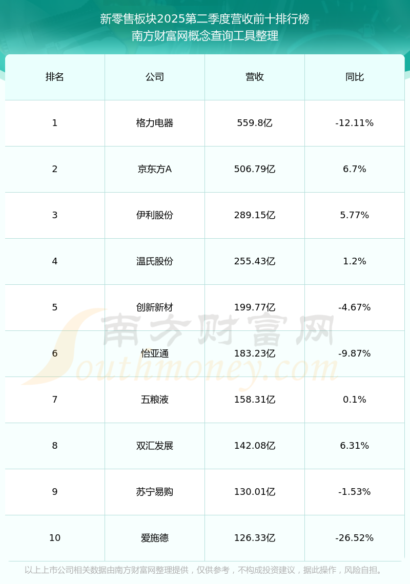 按照南方財富網(wǎng)概念查詢工具統(tǒng)計,該股所屬板塊為新零售板塊,該板塊共有206只股票,豫園股份2025第二季度營收在該板塊中排名為第16名,該板塊2025第二季度營收排名前十的股票如下表: