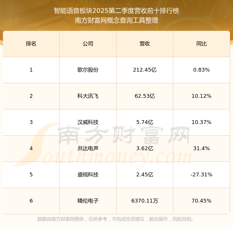 按照南方財(cái)富網(wǎng)概念查詢工具統(tǒng)計(jì),該股所屬板塊為智能語(yǔ)音板塊,該板塊共有6只股票,海天瑞聲2025第二季度營(yíng)收在該板塊中排名為第6名,該板塊2025第二季度營(yíng)收排名前十的股票如下表: