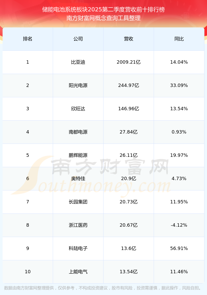 按照南方財(cái)富網(wǎng)概念查詢工具統(tǒng)計(jì),該股所屬板塊為儲(chǔ)能電池系統(tǒng)板塊,該板塊共有11只股票,派能科技2025第二季度營收在該板塊中排名為第11名,該板塊2025第二季度營收排名前十的股票如下表: