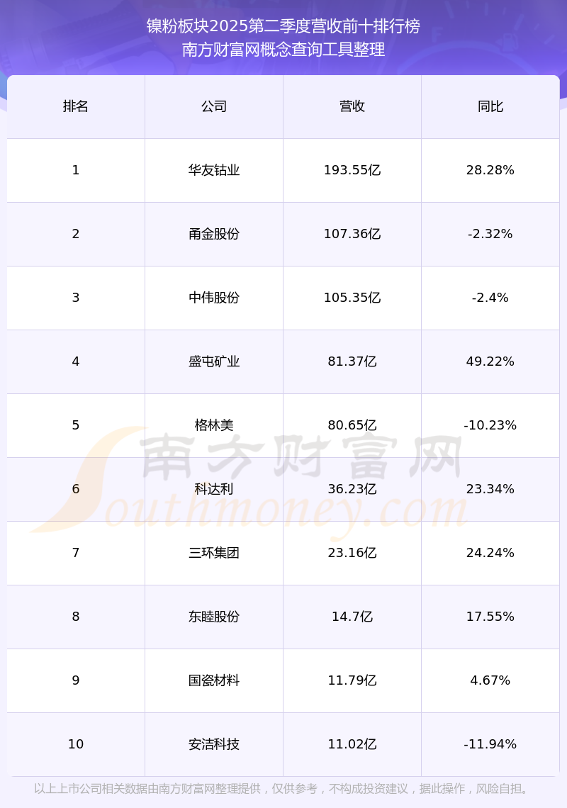 按照南方財(cái)富網(wǎng)概念查詢工具統(tǒng)計(jì),該股所屬板塊為鎳粉板塊,該板塊共有19只股票,博遷新材2025第二季度營收在該板塊中排名為第15名,該板塊2025第二季度營收排名前十的股票如下表: