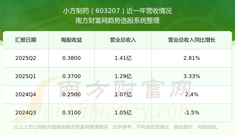 小方制藥2025年第二季度顯示,公司主營收入1.41億元,同比2.81%;歸母凈利潤6097.86萬元,同比-8.46%;扣非凈利潤6137.88萬元,同比-7.81%。