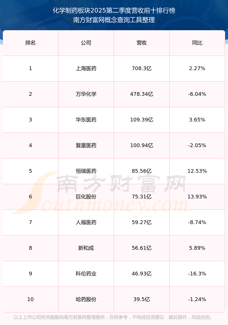 按照南方財富網(wǎng)概念查詢工具統(tǒng)計,該股所屬板塊為化學制藥板塊,該板塊共有183只股票,小方制藥2025第二季度營收在該板塊中排名為第143名,該板塊2025第二季度營收排名前十的股票如下表: