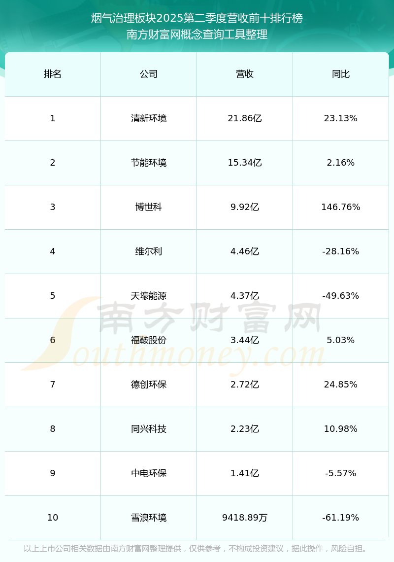 按照南方財(cái)富網(wǎng)概念查詢工具統(tǒng)計(jì),該股所屬板塊為煙氣治理板塊,該板塊共有11只股票,德創(chuàng)環(huán)保2025第二季度營收在該板塊中排名為第7名,該板塊2025第二季度營收排名前十的股票如下表: