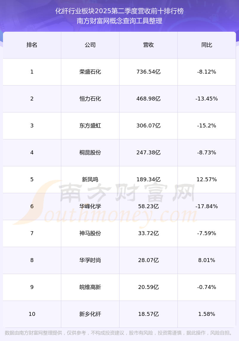 按照南方財(cái)富網(wǎng)概念查詢工具統(tǒng)計(jì),該股所屬板塊為化纖行業(yè)板塊,該板塊共有31只股票,皖維高新2025第二季度營收在該板塊中排名為第9名,該板塊2025第二季度營收排名前十的股票如下表: