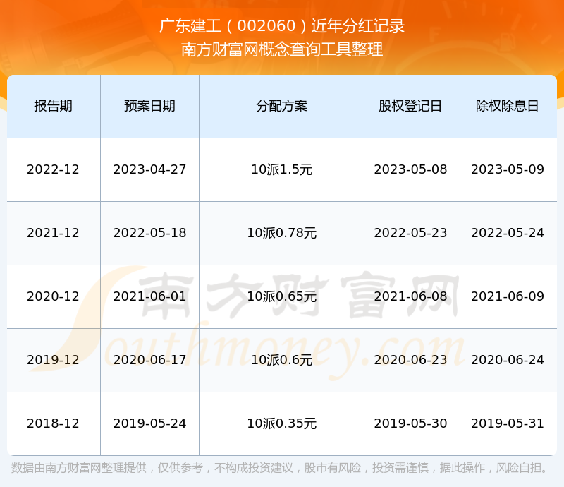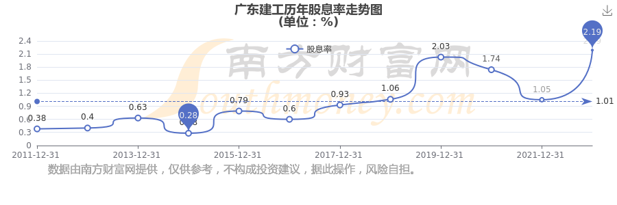 廣東建工最新一次公布的分紅方案為10派1.5元。本次權(quán)益分派股權(quán)登記日為2023年5月8日,除權(quán)除息日為2023年5月9日,派息日為2023年5月9日。