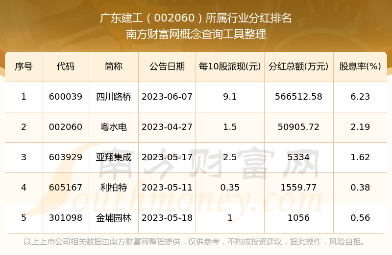 按照南方財富網(wǎng)趨勢選股系統(tǒng)統(tǒng)計,廣東建工所屬行業(yè)為工程施工行業(yè),工程施工行業(yè)分紅排名情況如下表: