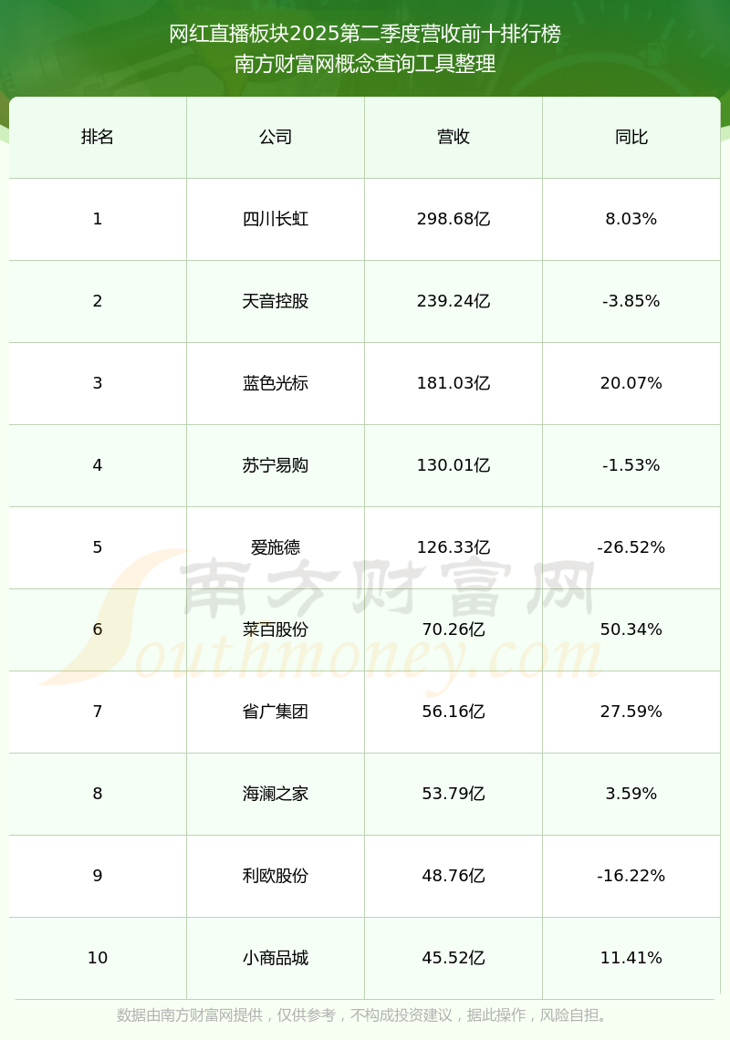 按照南方財(cái)富網(wǎng)概念查詢工具統(tǒng)計(jì),該股所屬板塊為網(wǎng)紅直播板塊,該板塊共有135只股票,紅豆股份2025第二季度營(yíng)收在該板塊中排名為第80名,該板塊2025第二季度營(yíng)收排名前十的股票如下表: