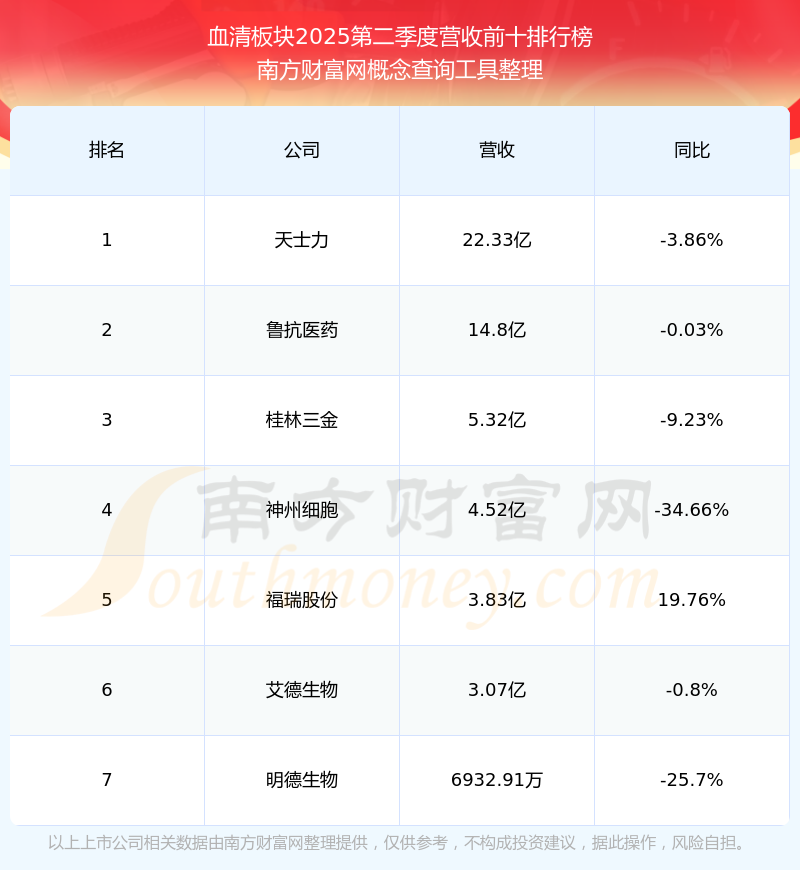 按照南方財富網(wǎng)概念查詢工具統(tǒng)計,該股所屬板塊為血清板塊,該板塊共有7只股票,賽倫生物2025第二季度營收在該板塊中排名為第7名,該板塊2025第二季度營收排名前十的股票如下表: