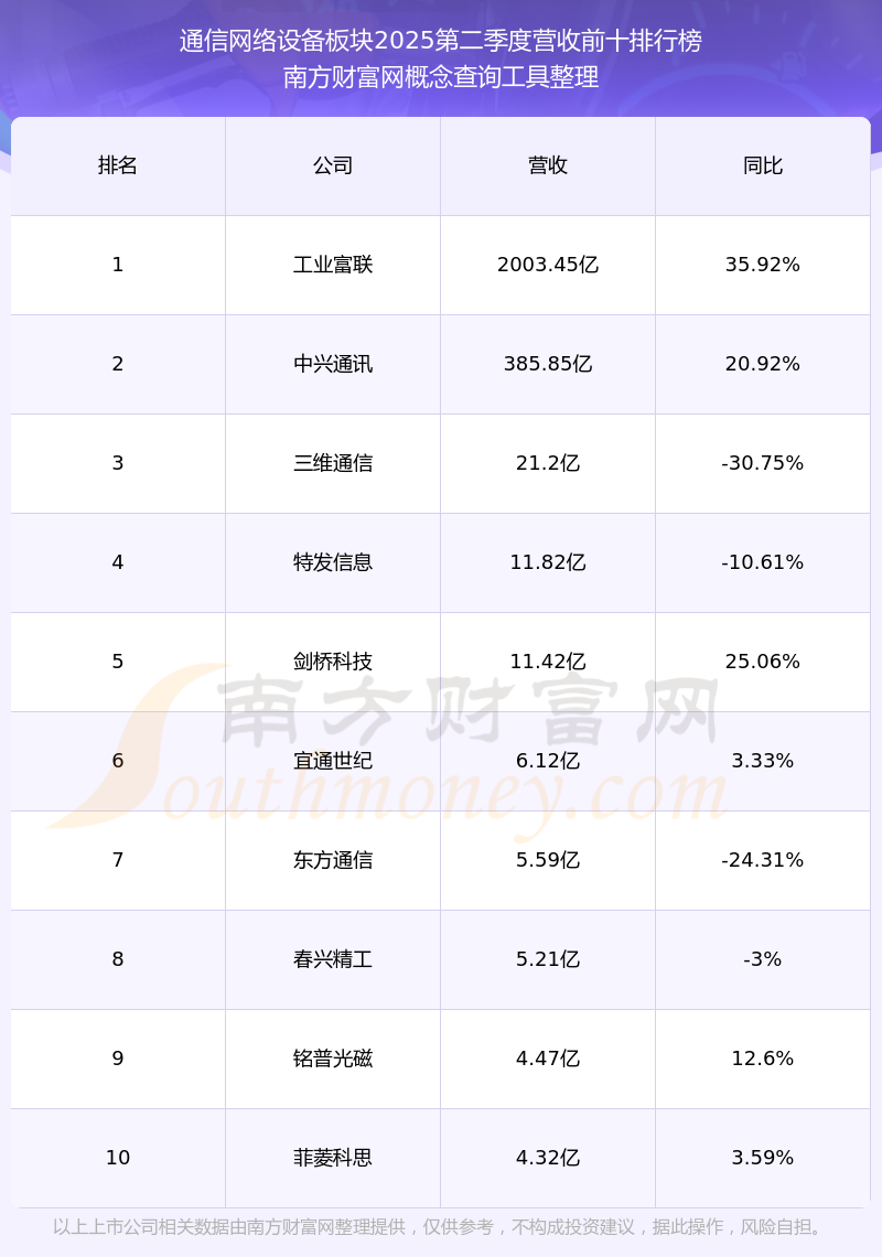 按照南方財富網(wǎng)概念查詢工具統(tǒng)計,該股所屬板塊為通信網(wǎng)絡設備板塊,該板塊共有16只股票,華脈科技2025第二季度營收在該板塊中排名為第12名,該板塊2025第二季度營收排名前十的股票如下表: