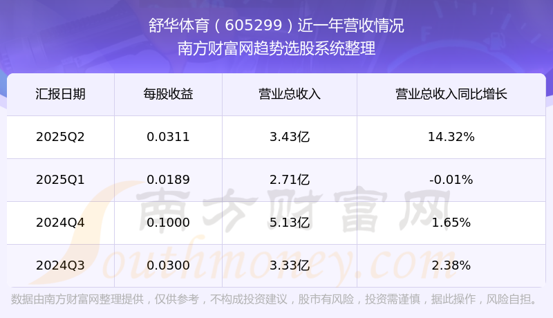 舒華體育發(fā)布2025年第二季度財(cái)報(bào)。實(shí)現(xiàn)總營收3.43億元,同比增長14.32%;扣非凈利潤同比增長-24.4%至1023.76萬元。
