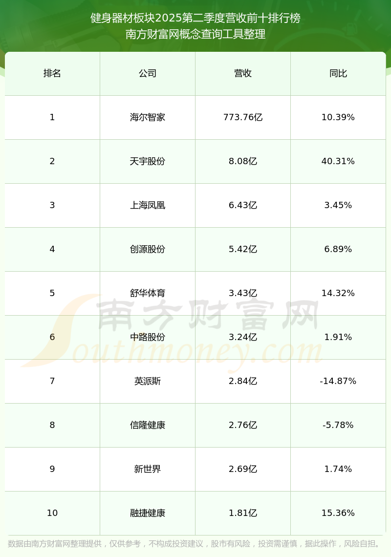 按照南方財(cái)富網(wǎng)概念查詢工具統(tǒng)計(jì),該股所屬板塊為健身器材板塊,該板塊共有12只股票,舒華體育2025第二季度營收在該板塊中排名為第5名,該板塊2025第二季度營收排名前十的股票如下表: