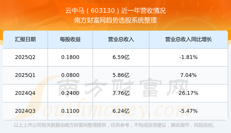 財(cái)報(bào)顯示,2025年第二季度云中馬營(yíng)收6.59億元,同比增長(zhǎng)-1.81%,凈利潤(rùn)2541.44萬元,同比增長(zhǎng)-6.95%。