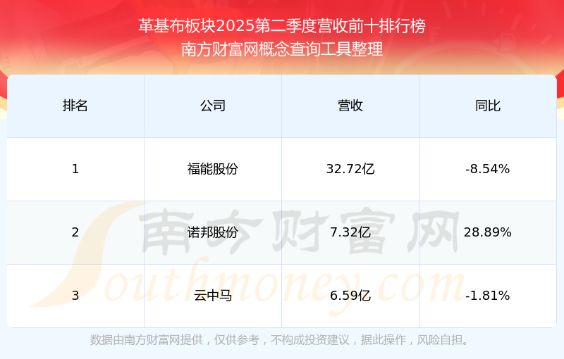 按照南方財(cái)富網(wǎng)概念查詢工具統(tǒng)計(jì),該股所屬板塊為革基布板塊,該板塊共有3只股票,云中馬2025第二季度營(yíng)收在該板塊中排名為第3名,該板塊2025第二季度營(yíng)收排名前十的股票如下表: