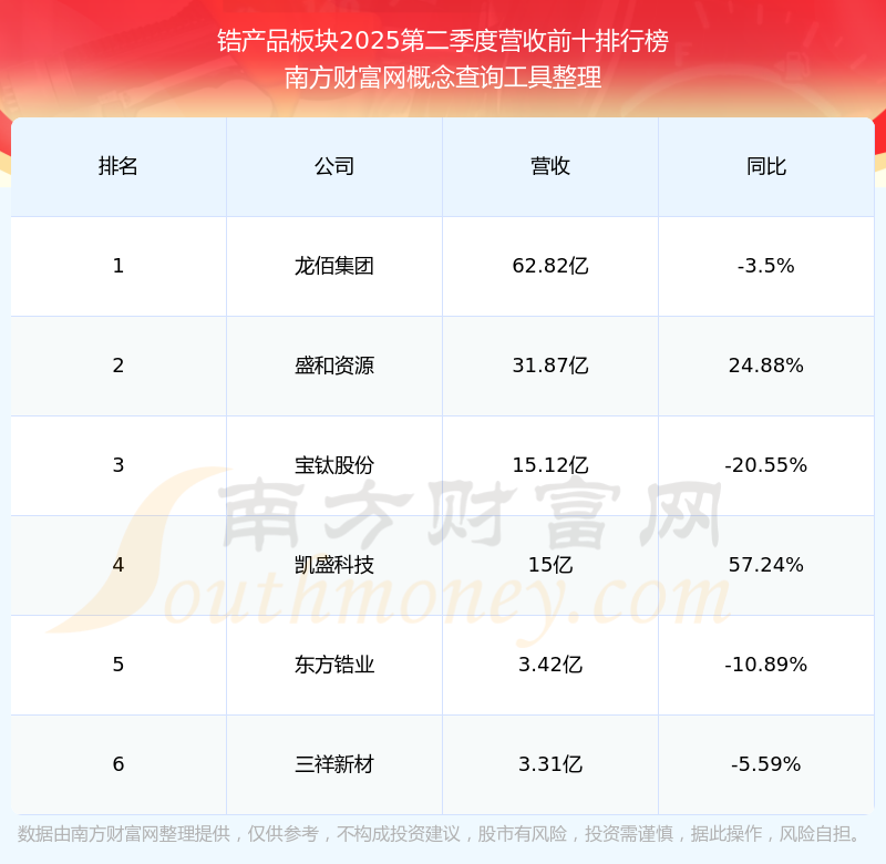 按照南方財(cái)富網(wǎng)概念查詢工具統(tǒng)計(jì),該股所屬板塊為鋯產(chǎn)品板塊,該板塊共有6只股票,三祥新材2025第二季度營收在該板塊中排名為第6名,該板塊2025第二季度營收排名前十的股票如下表: