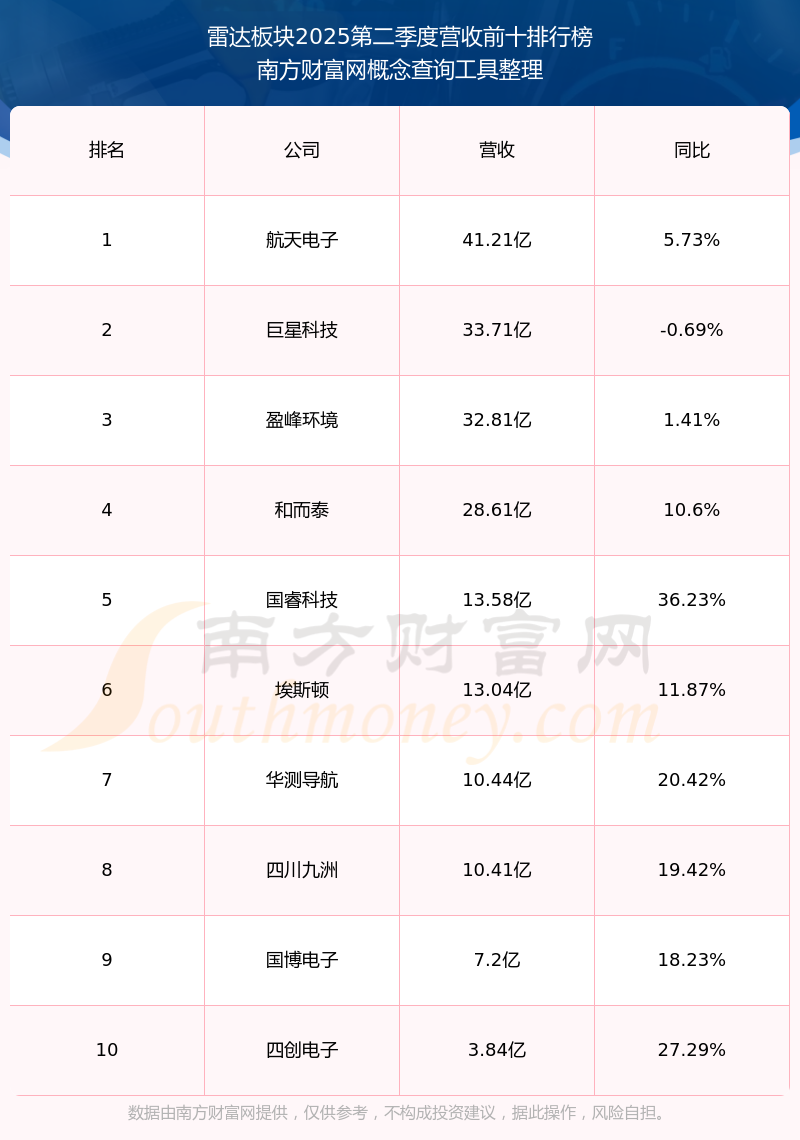 按照南方財(cái)富網(wǎng)概念查詢工具統(tǒng)計(jì),該股所屬板塊為雷達(dá)板塊,該板塊共有29只股票,航天南湖2025第二季度營(yíng)收在該板塊中排名為第29名,該板塊2025第二季度營(yíng)收排名前十的股票如下表: