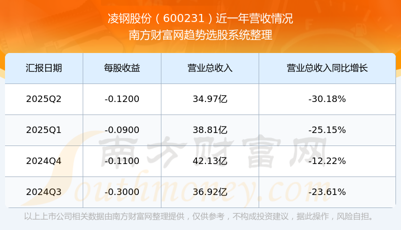 凌鋼股份2025年第二季度財(cái)報(bào)顯示,公司主營(yíng)收入34.97億元,同比-30.18%;歸母凈利潤(rùn)-3.26億元,同比-61.19%;扣非凈利潤(rùn)-3.24億元,同比-56.36%。