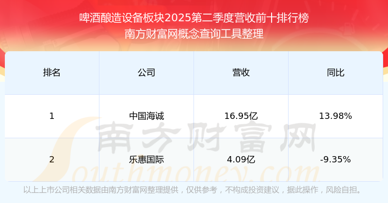 按照南方財富網(wǎng)概念查詢工具統(tǒng)計,該股所屬板塊為啤酒釀造設(shè)備板塊,該板塊共有2只股票,樂惠國際2025第二季度營收在該板塊中排名為第2名,該板塊2025第二季度營收排名前十的股票如下表: