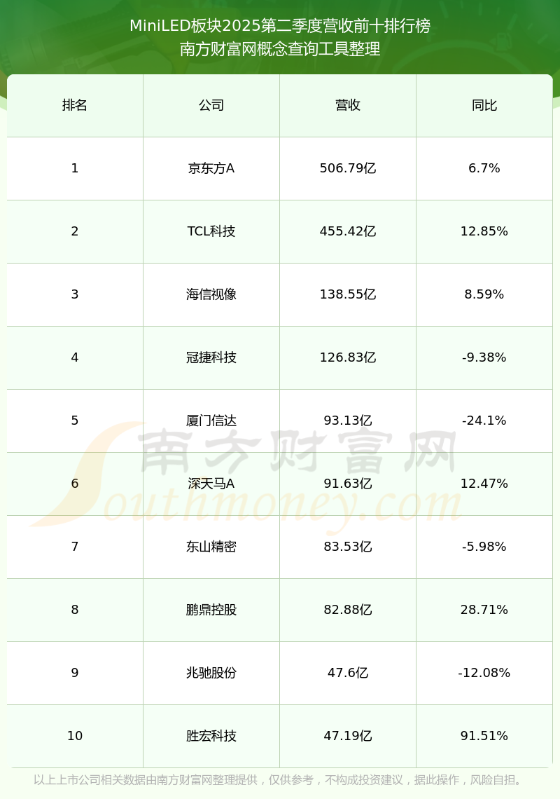 按照南方財(cái)富網(wǎng)概念查詢工具統(tǒng)計(jì),該股所屬板塊為MiniLED板塊,該板塊共有77只股票,博敏電子2025第二季度營(yíng)收在該板塊中排名為第36名,該板塊2025第二季度營(yíng)收排名前十的股票如下表: