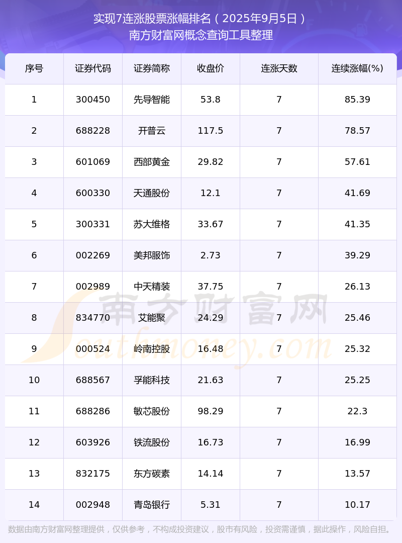 2025年9月5日實現(xiàn)7連漲股票漲幅排名