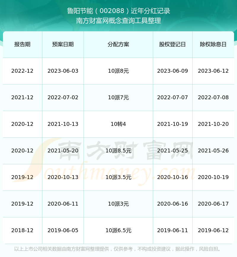 近年魯陽(yáng)節(jié)能分紅派息情況如下表所示: