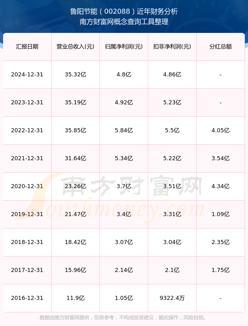 魯陽(yáng)節(jié)能2024年總營(yíng)收35.32億,同比增長(zhǎng)0.38%;凈利潤(rùn)4.8億,同比增長(zhǎng)-2.42%;銷(xiāo)售毛利率30.59%。