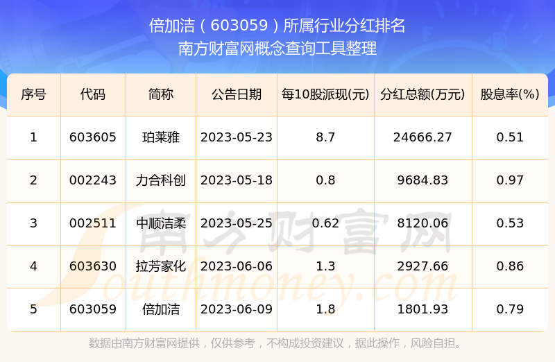 按照南方財富網(wǎng)趨勢選股系統(tǒng)統(tǒng)計,倍加潔所屬行業(yè)為牙刷行業(yè),牙刷行業(yè)分紅排名情況如下表: