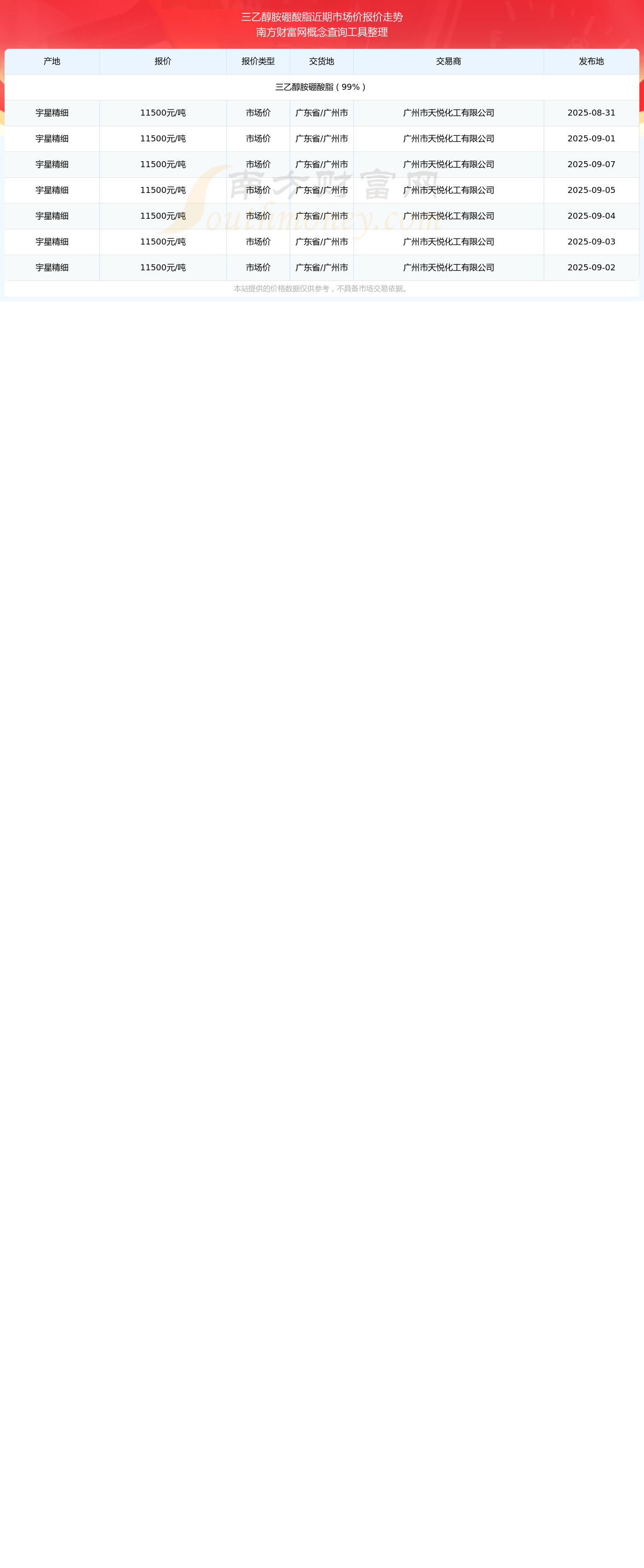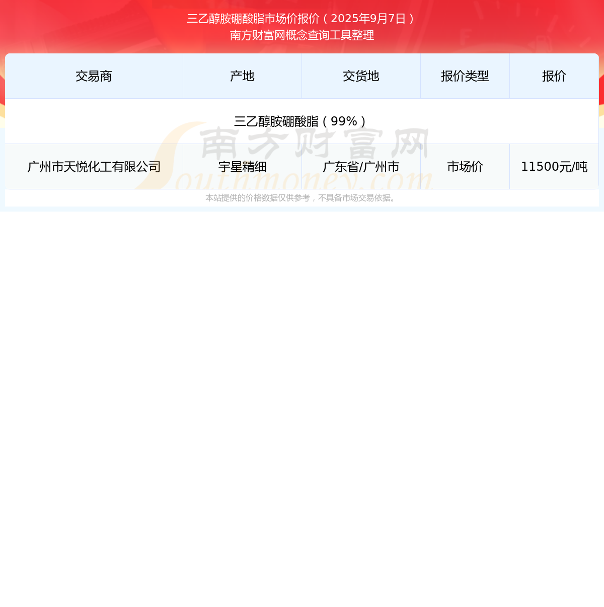 2025年9月7日,廣州市天悅化工有限公司三乙醇胺硼酸脂(99%),宇星精細(xì),交易地點(diǎn)為廣東省/廣州市,市場價(jià)報(bào)價(jià)為11500.00元/噸。