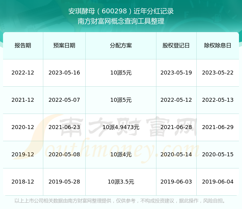 安琪酵母最新一次公布的分紅方案為10派5元。本次權(quán)益分派股權(quán)登記日為2023年5月19日,除權(quán)除息日為2023年5月22日,派息日為2023年5月22日。