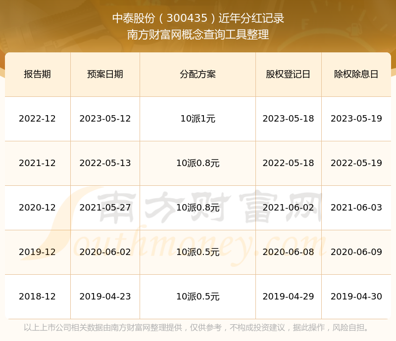 近年中泰股份分紅派息情況如下表所示: